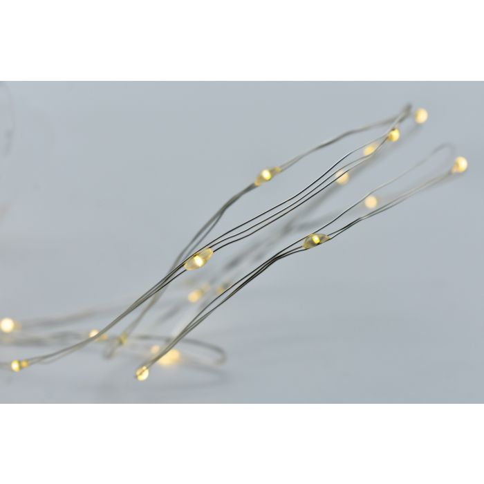 | Note | - Lunghezza  catena luminosa: 15mt;  - Lunghezza cavo di alimentazione: 30cm; - Filo in metallo modellabile; - Giochi di luce memory con timer (6 ore ON/18 ore OFF); - Funziona a batteria (3xAA non incluse); - Per uso interno ed esterno  |