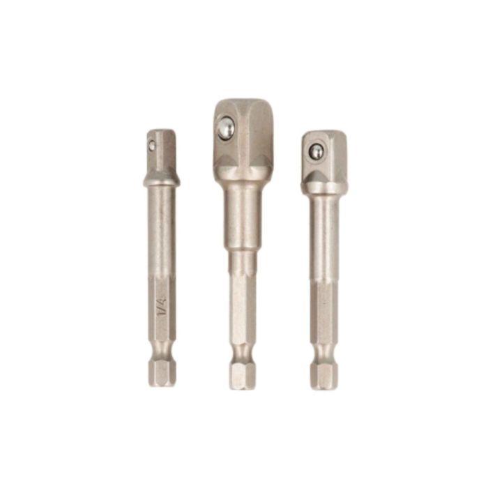 Set di 3 adattatori da 50 mm con attacco esagonale 1/4" e teste quadrate con intaglio 1/4", 3/8" e 1/2" complete di sfera di ritenzione, realizzati in robusto acciaio 50BV30 per garantire resistenza e lunga durata, ideali per ampliare la compatibilità tra utensili e inserti; confezione in blister appendibile.