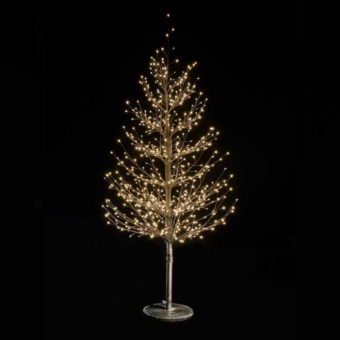 Albero a forma di abete alto 120 cm in PVC, metallo e resina, con base in resina dal diametro 20cm, dotato di 690 LED bianco caldo a luce fissa, cavo di 5mt e adattatore GS 24 V 6 W, adatto per uso interno ed esterno.