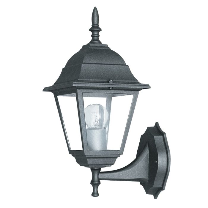 Lanterna a muro in alluminio pressofuso con diffusore in vetro trasparente.