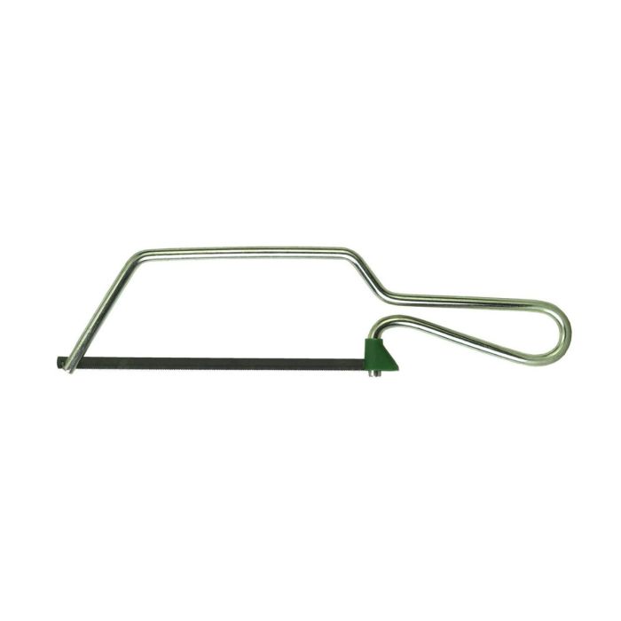 Archetto tipo "Puk" 150 mm in tondino di ferro con lama per metallo, compatto e robusto, progettato per tagli precisi su lamiere e profilati; la struttura in tondino garantisce resistenza e controllo durante l’uso, rendendolo ideale per lavori di carpenteria leggera, officina e fai‑da‑te dove serve un utensile affidabile e maneggevole.