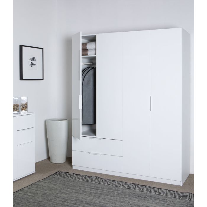 - 2 Cassetti DOTAZIONE INTERNA: - 3 Ripiani - 1 Tubo appendiabito - Maniglia in metallo bianco |