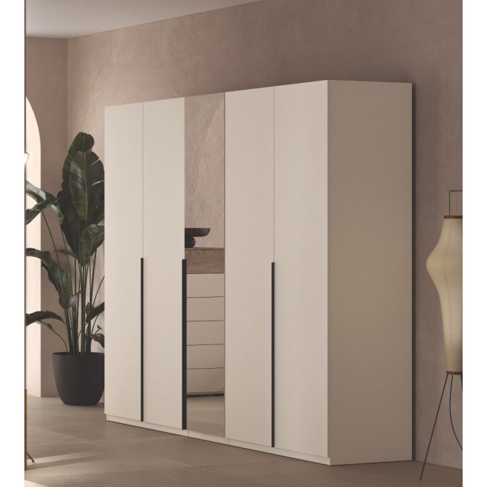 L'armadio ad anta battente mod. FAVORITA è realizzato in laminato colore cashmire opaco, misura 229,9×63,3 × h. 222,6 cm e presenta cinque ante con anta centrale a specchio, maniglia in metallo color antracite, due tubi appendiabiti, due ripiani grandi e quattro ripiani piccoli; dal design razionale e raffinato offre ampia organizzazione interna per la camera da letto ed è fornito smontato in kit di montaggio per un trasporto e un'installazione pratici.
