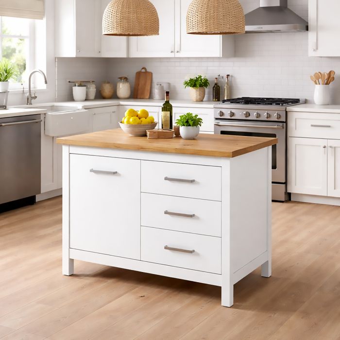 Il bancone da cucina è realizzato in laminato finitura White con top in laminato Rovere Artisan bifacciale, progettato per offrire praticità e stile in uno spazio compatto; la struttura comprende tre cassetti frontali a scorrimento fluido, un’anta posizionata sul lato sinistro con all’interno un ripiano regolabile, e un lato aperto dotato di due vani a giorno ideali per riporre oggetti d’uso frequente o elementi decorativi; le maniglie sono in metallo finitura silver, robuste e moderne, mentre le dimensioni complessive del mobile sono 124X75 H.91.5 cm; il prodotto è fornito in kit smontato completo di ferramenta e istruzioni per un montaggio semplice e intuitivo.