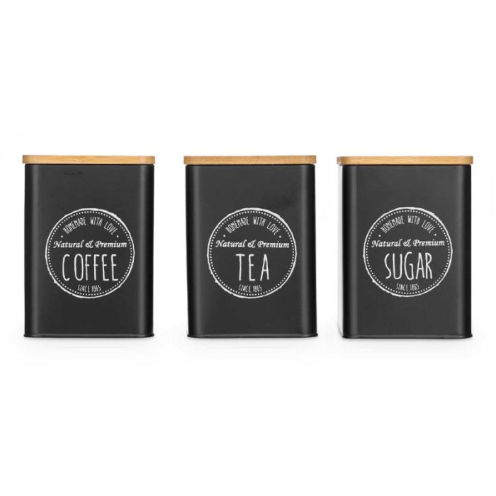 Barattolo in metallo nero dimensioni 9,8 × 9,8 h. 13,8cm, dotato di tappo in legno di bambù e proposto in fantasie assortite con la scritta COFFEE, TEA o SUGAR che indicano e consigliano l’ingrediente più adatto da conservare (caffè, tè e zucchero); prodotto assortito venduto singolarmente (si può acquistare un solo pezzo tra i tre disponibili), finitura resistente e design compatto ideale per organizzare la dispensa con stile.