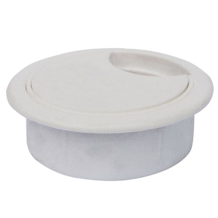 Bocchetta passacavi in plastica bianca diametro Ø 60 mm, ideale per il passaggio e l’organizzazione dei cavi su scrivanie e postazioni di lavoro; dotata di apertura regolabile e fissaggio ad incastro per un’installazione rapida senza utensili, garantisce una finitura ordinata, protegge i cavi dall’usura e riduce l’ingombro, perfetta per piani con foro da 60 mm.
