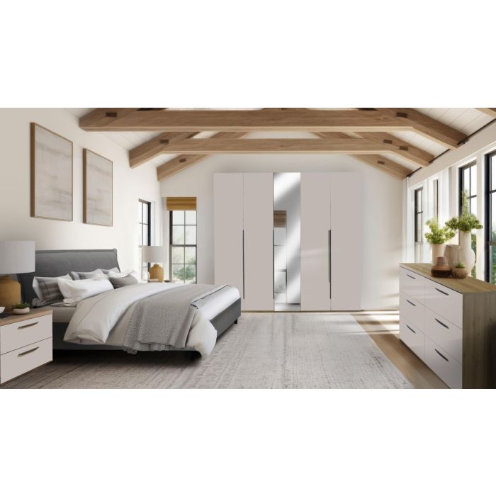 Armadio a 5 ante battenti, di cui una con specchio, dotato internamente di 2 ripiani grandi, 4 ripiani piccoli e 2 tubi appendiabiti per una gestione ottimale del guardaroba