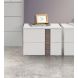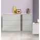 Il gruppo letto include due comodini da 55,2 x 45,2 x H 44,5 cm, ciascuno dotato di due cassetti con chiusura ammortizzata, e un comò da 128,7 x 54,2 x H 74,3 cm con tre ampi cassetti anch’essi a chiusura rallentata.