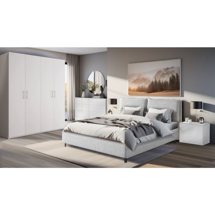 Armadio a 4 ante battenti in bianco opaco, caratterizzato da linee pulite e moderne, ideale per organizzare con ordine abiti e accessori.