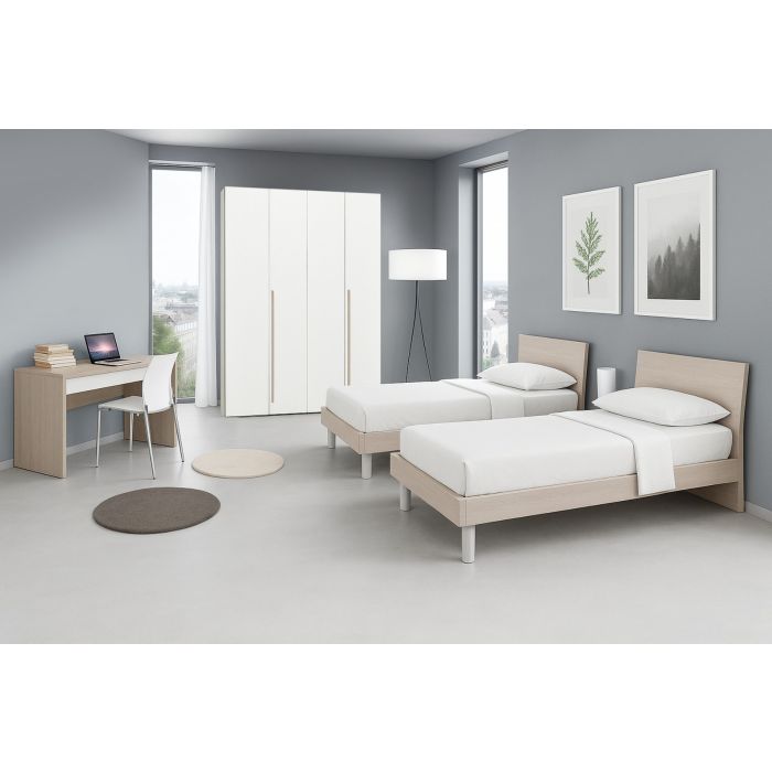 Dotazione interna: - 2 Ripiani - 4 Tubi appendiabito - 2 Letti singoli con giroletto cm 90X206 H.88 - 1 Comodino con 2 cassetti cm 47.5X37 H.44 - Scrivania cm 100X50 H.74 - Reti e materassi 80X190 NON compresi |