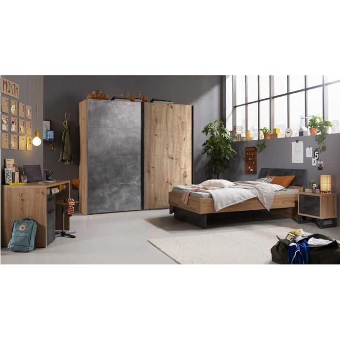 Questa elegante cameretta è realizzata in laminato rovere artisan, con frontali in rovere artisan e tadao, per un effetto caldo e contemporaneo che valorizza ogni ambiente. La composizione include: