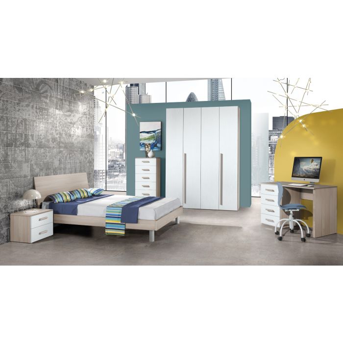 - Armadio 4 Ante battenti cm 173X55 H.240 Dotazione interna: - 2 Ripiani - 4 Tubi appendiabito - Letto con giroletto 1 piazza e 1/2 cm 130X206 H.88 - Rete e materasso 120X190 NON compresi - Comodino 2 cassetti 52X37 H.44 cm - Settimino 6 cassetti 52X37 H.125 cm - Scrivania 100X50 H.74 cm |