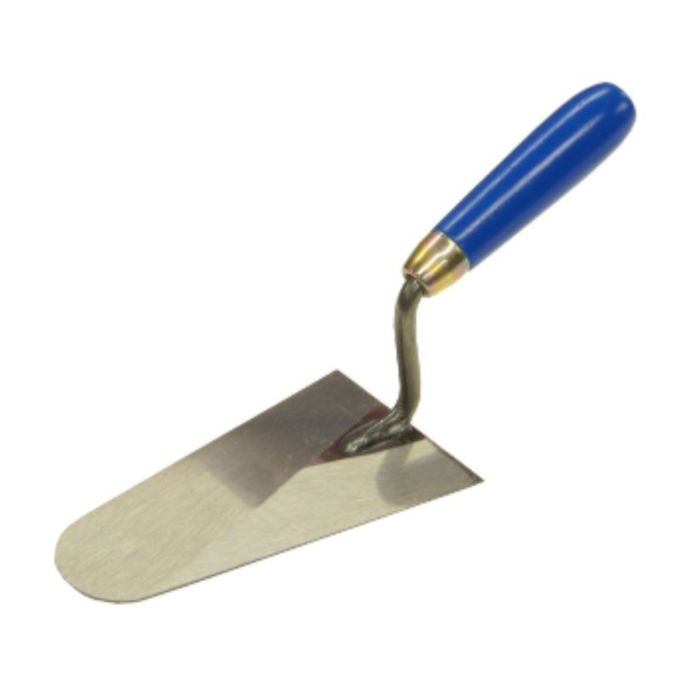 Cazzuola a punta tonda stretta da 160 mm, dotata di manico saldato e impugnatura in legno, ideale per lavori di finitura e applicazioni di precisione; robusta, maneggevole e perfetta per utilizzi professionali e fai‑da‑te.