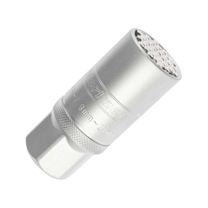 Chiave multiuso 9–21 mm compatta e versatile, dotata di 43 perni speciali caricati a molla che si adattano perfettamente a qualsiasi vite o dado con profilo esterno, include adattatore 1/2", misura 64 × 28 mm e pesa 170 g, ideale per sostituire più chiavi tradizionali e affrontare rapidamente fissaggi di diverse misure in ambito professionale e fai‑da‑te.