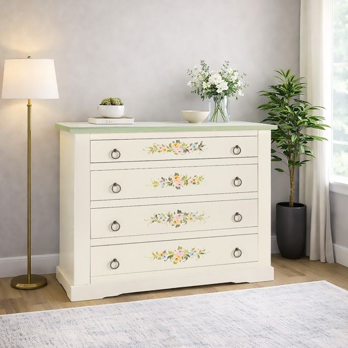 COMO' IN LEGNO MASSELLO CM 115X50 H. 90 LACCATO BIANCO CON DECORI