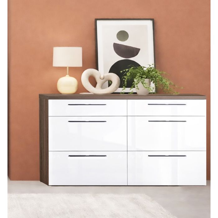 Comò modello MOMENTI con struttura in laminato rovere tartufo, dimensioni 140×45×h.81 cm, dotato di 6 cassetti in bianco lucido con maniglie in metallo per un design elegante e funzionale; prodotto fornito completamente smontato in kit di montaggio, facile da assemblare e ideale per arredare con stile camere moderne.
