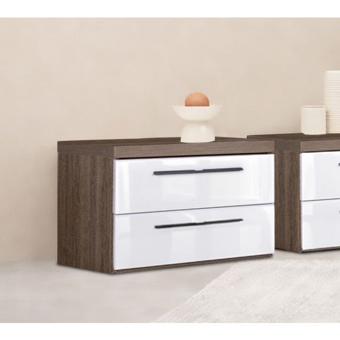 Comodino modello MOMENTI con struttura in laminato rovere tartufo, dimensioni 60×45×h.37,2 cm, dotato di 2 cassetti in bianco lucido con maniglie in metallo per un look moderno e funzionale; prodotto fornito smontato in kit di montaggio, facile da assemblare e ideale per camere dal design contemporaneo.