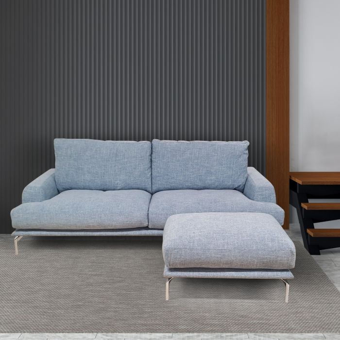 Eleganza, comfort e versatilità si incontrano in questa raffinata composizione composta da un divano 3 posti maxi e pouf abbinato, entrambi rivestiti in un delicato tessuto azzurro che dona luminosità e freschezza all’ambiente.