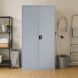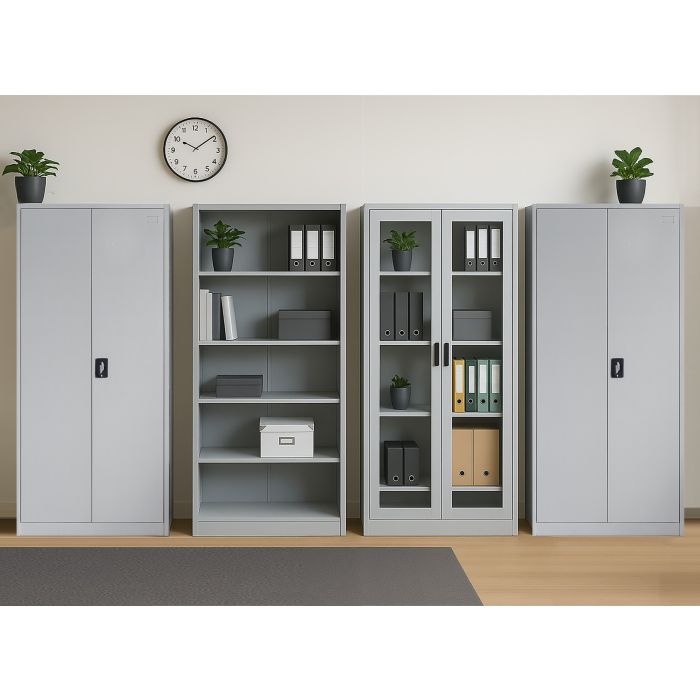 La composizione è realizzata in metallo verniciato grigio opaco, dal design essenziale e robusto, ideale per ambienti professionali e domestici che richiedono ordine e funzionalità.