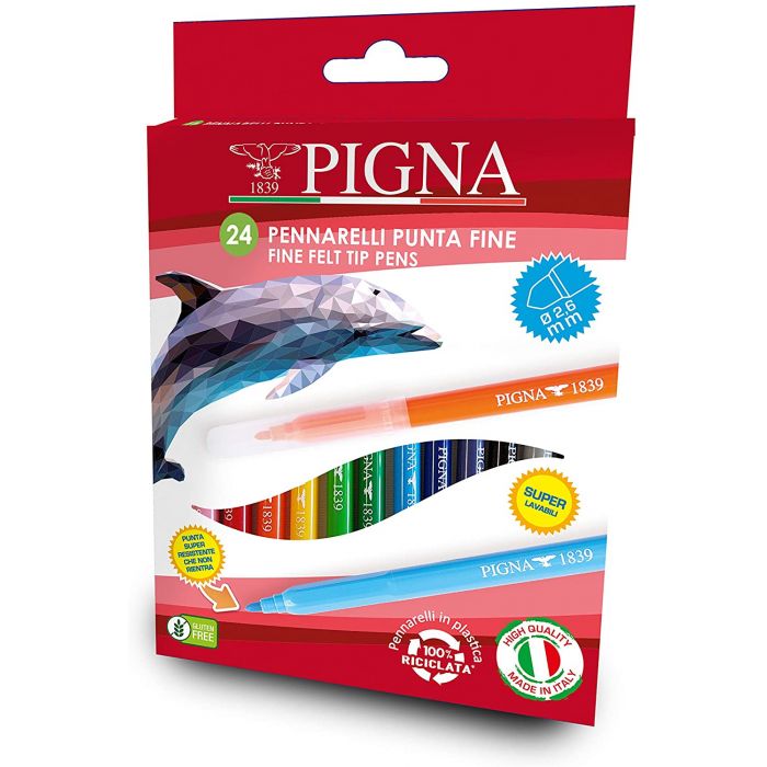 E' una bellissima confezione da 24 pennarelli di Pigna con la punta fine. Hanno il tappo saldato e il cappuccio ventilato, inoltre l'inchiostro è atossico e lavabile sulla maggiore parte dei tessuti. Perfetti per la scuola e per il tempo libero dei tuoi bimbi stimoleranno la loro fantasia e creatività.
