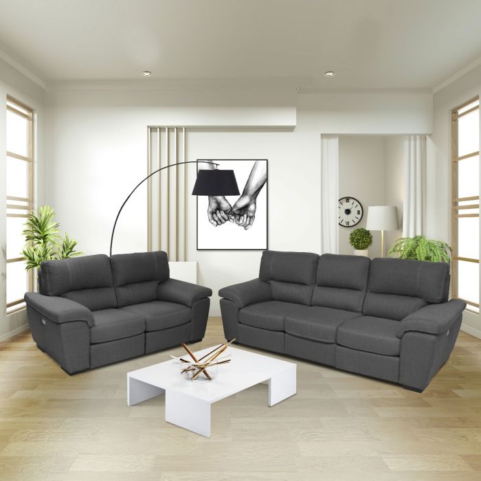 Coppia divani in tessuto con due recliner elettrici.