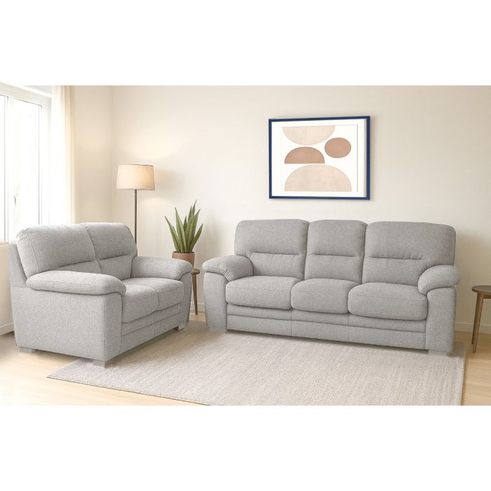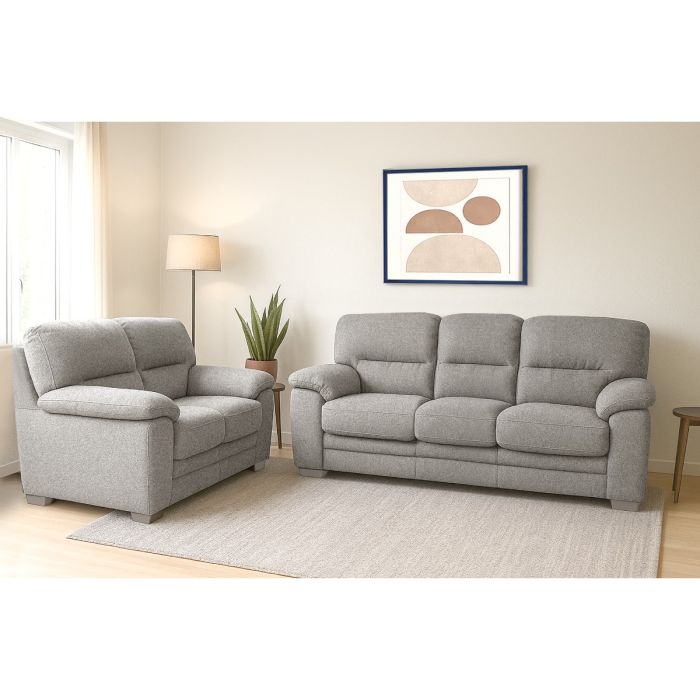 Raffinata coppia di divani composta da un modello 2 posti e uno 3 posti, perfetti per arredare con gusto e funzionalità il tuo salotto. Realizzati in tessuto grigio chiaro, si distinguono per la loro linea pulita e contemporanea, ideale per ambienti moderni e classici.