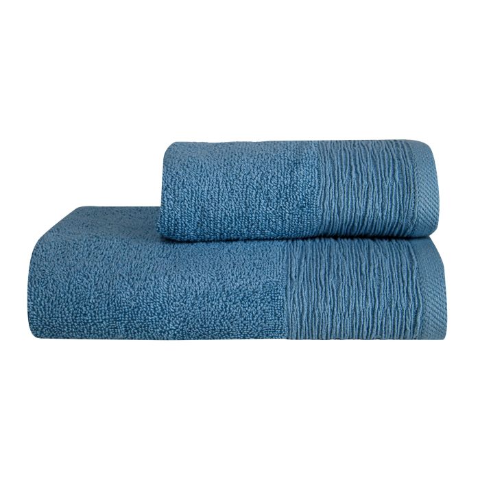 Coppia spugna NAVIGARE composta da asciugamano (40×50 cm) e asciugamano ospite (50×100 cm) in tinta unita con grammatura 500 g/m², morbida, assorbente e ideale per l’uso quotidiano; disponibile in varianti assortite tra cui scegliere un singolo set.