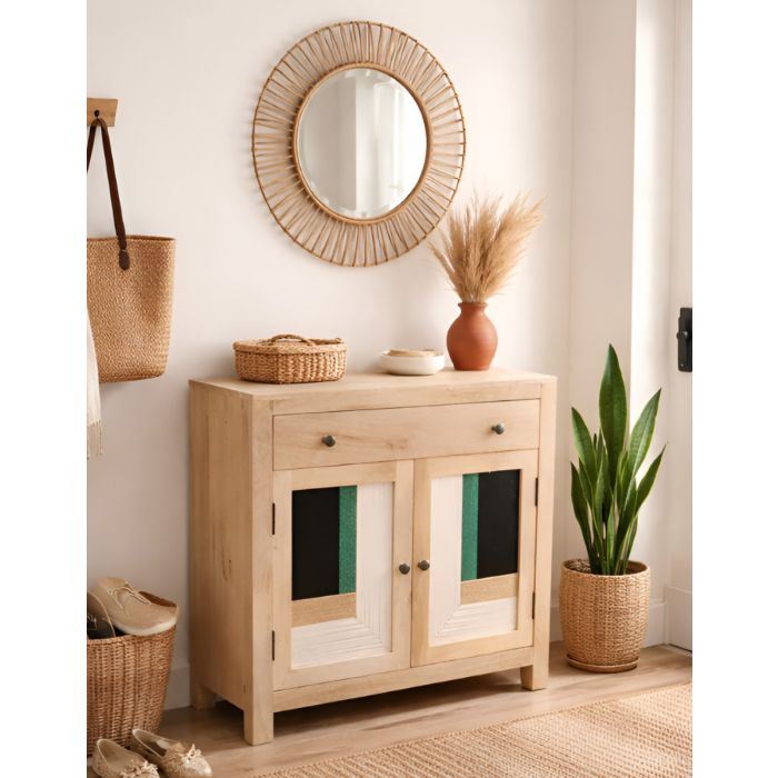 - 2 Ante con inserto in corda intrecciata multicolore - 1 Ripiano fisso in legno |