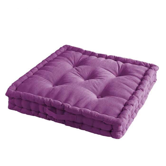 Cuscino materasso realizzato in cotone pacifique, colore viola. Il tessuto è confortevole alla seduta e rende l'ambiente circostante ancor più vivace e accogliente. È quadrangolare, trapuntato e l'imbottitura interna non può essere sfoderata. In aggiunta, al cuscino è attaccata una presa, la quale facilita lo spostamento del cuscino. Si consiglia un lavaggio a mano del tessuto, misura: 60x60x10cm.