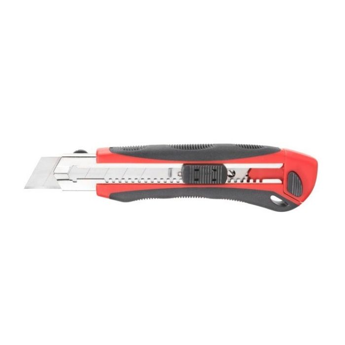 Cutter universale con lama da 25 mm certificato TUV‑GS, dotato di manico ergonomico in plastica bicomponente per una presa sicura e confortevole, lama fissata tramite pratica ruota di bloccaggio e guida in metallo per tagli precisi, caricatore integrato con 3 lame di ricambio e sistema di cambio lama automatico, occhiello per appendere lo strumento; ideale per lavori su materiali come cartongesso e per uso professionale e fai‑da‑te.