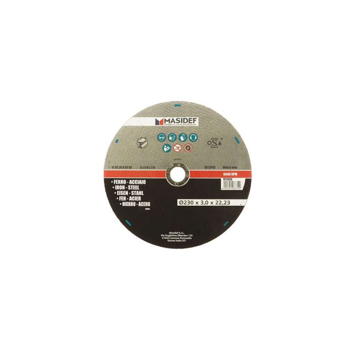Disco da taglio per acciaio e materiali ferrosi, sagoma piatta con Ø esterno 230 mm, Ø interno 22,23 mm e spessore 3,0 mm, progettato per garantire un taglio veloce e durata extra lunga su acciai, leghe e fusioni; prestazioni operative a 80 m/s e fino a 6.600 rpm, certificato OSA per uso professionale in officine e cantieri.