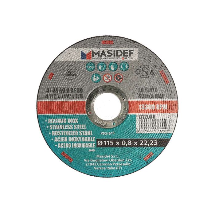 Disco da taglio per acciaio INOX, sagoma piatta con Ø esterno 115 mm, Ø interno 22,23 mm e spessore 0,8 mm, progettato per tagli rapidi e durata extra lunga su acciaio inox e acciaio; trattamento privo di componenti ferrosi (Fe), clorurati (Cl) e cariche solforose (S) per evitare contaminazioni, prestazioni garantite a 80 m/s e fino a 13.300 rpm, certificato OSA per l’uso professionale in officine e cantieri.