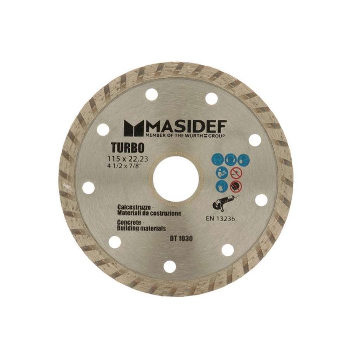 Disco da taglio turbo diamantato con corona a lama scanalata, progettato per taglio veloce su calcestruzzo e tutti i tipi di materiali da costruzione; trattamento diamantato e sinterizzato su sagoma piatta per massima durata e resa, con Ø esterno 115 mm, Ø interno 22,23 mm, spessore 2,2 mm, prestazioni a 80 m/s e fino a 13.300 rpm, consigliato per l’uso con smerigliatrici angolari e troncatrici a benzina in cantiere e lavori professionali.