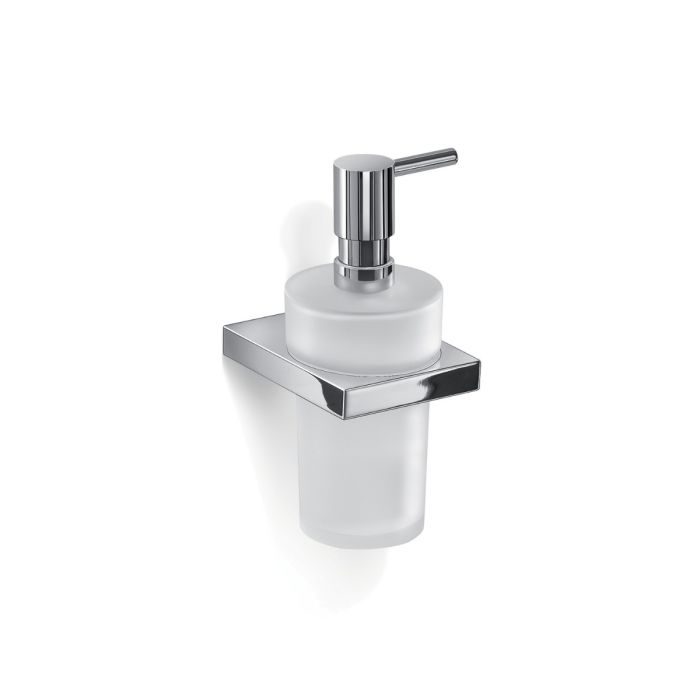 Dosasapone linea LANZAROTE in ottone e Cromall, finitura cromata, dimensioni 7,8×10,7 h. 18,2cm (L×P×H); contenitore in vetro satinato, erogatore in acciaio inox AISI 304 e fissaggio a muro con viti; design elegante e robusto con finiture lucide, facile da installare e da pulire, perfetto per aggiungere un tocco raffinato e funzionale al bagno.