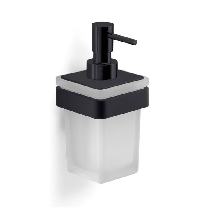 Dosasapone linea SAMOA in ottone e Cromall, colore nero matt, dimensioni 7,5×10,6 h. 16,4cm (L×P×H); contenitore in vetro satinato, erogatore in Cromall e fissaggio a muro con viti; design elegante e robusto con finiture opache resistenti, facile da installare e da pulire, perfetto per aggiungere un tocco moderno e raffinato al bagno.