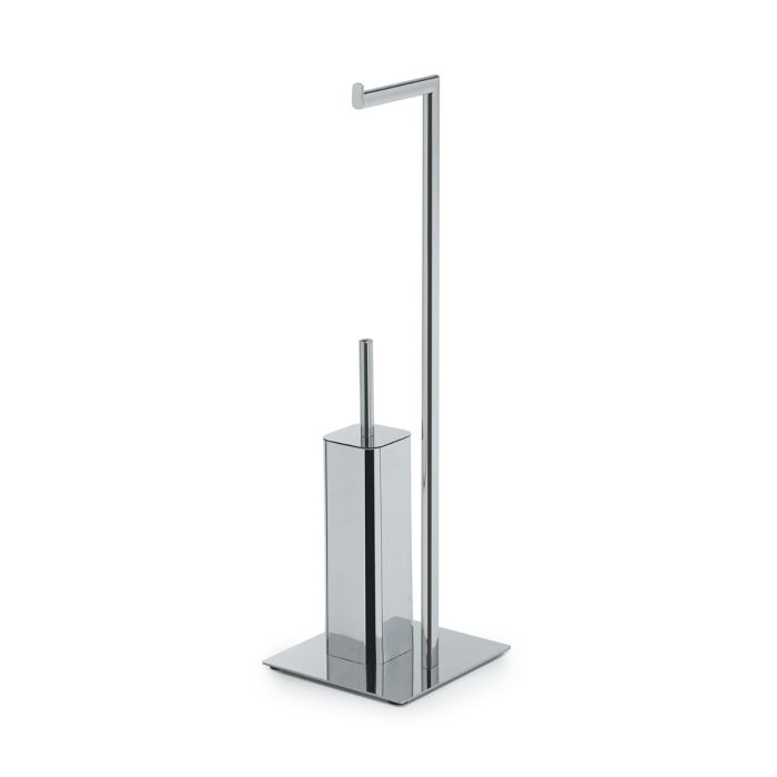 Piantana da bagno porta asciugamani/porta rotolo linea FELIX in acciaio inox, metallo e resine termoplastiche colore cromato, dimensioni 20×20 h. 69,8cm, dotata di scopino con ciuffo in setole nere e di tazza interna estraibile per una pulizia facile; design stabile e funzionale che unisce resistenza e finitura lucida per mantenere il bagno ordinato con stile.