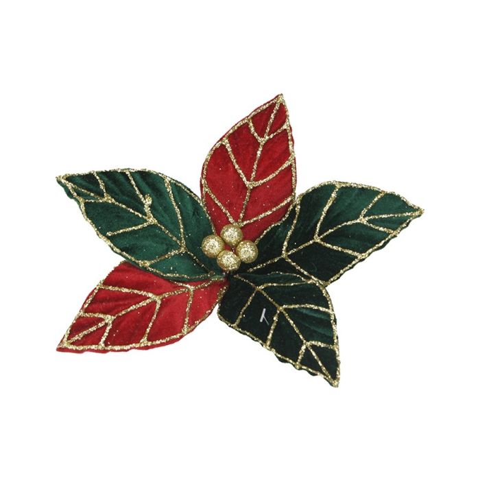 - Fiore in PVC con rivestimento in tessuto verde e rosso effetto velluto con bordo glitter oro - Arricchito all'interno con bacche oro glitter - Perfetto per impreziosire centrotavola e composizioni fiorite |