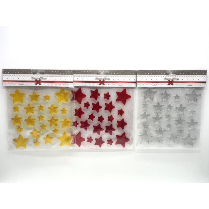 | Note | - Confezione di 22 vetrofanie in misure assortite; - Realizzate in PVC adesivo a forma di stelline; - Facili da attaccare su vetri e specchi basta detergere prima la superficie desiderata; - Si staccano facilmente senza lasciare residui Prodotto Assortito |