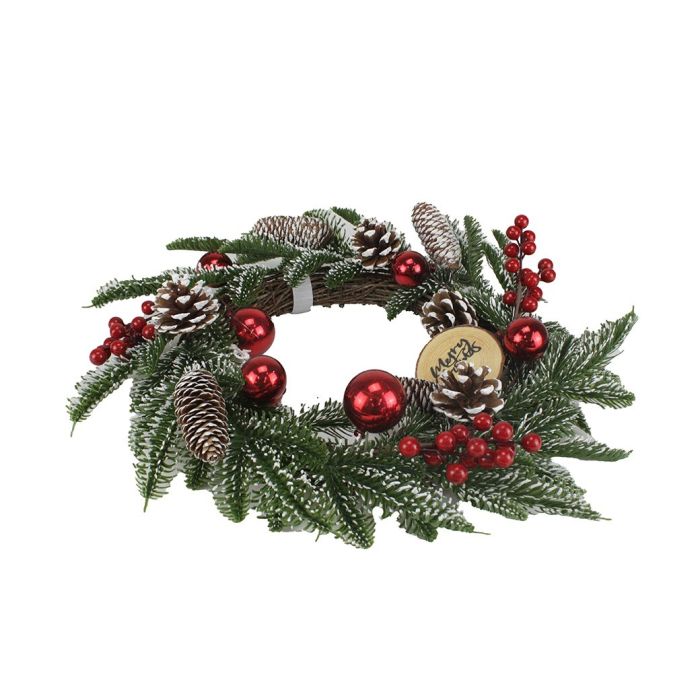 Note | - Ghirlanda su base in legno intrecciato; - Decorata con aghi di pino innevati, pigne e bacche rosse |
