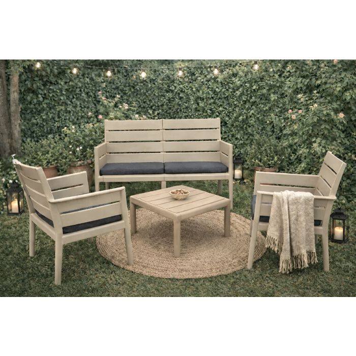 Il design moderno e accattivante del set Panka si fonde armoniosamente in qualsiasi contesto esterno, conferendo un tocco di stile e comfort. Realizzato con materiali di alta qualità e sostenibili, il set è prodotto utilizzando materiali riciclati post-consumo, testimonianza del nostro impegno per la sostenibilità ambientale. Con il set Panka, riceverai inoltre quattro comodi cuscini per la seduta, garantendo ulteriore comfort e un'esperienza di relax ottimale.