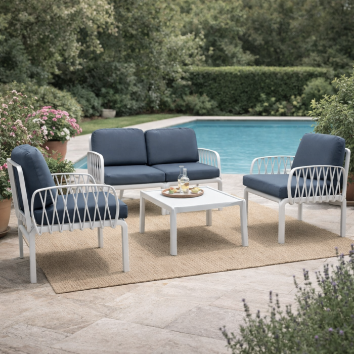 Il set Portofino è un set di arredi per esterni completo e funzionale, progettato per offrire comfort e stile. È composto da un divano a due posti, due poltrone e un tavolino pratico. Tutti gli elementi del set sono realizzati in polipropilene e fiberglass, materiali durevoli e resistenti alle intemperie. Con il suo design elegante e le caratteristiche funzionali, il set Portofino è l'ideale per arredare il tuo spazio all'aperto, che sia un patio, un giardino o una terrazza. Offre un ambiente accogliente per rilassarsi, socializzare e godersi la vita all'aria aperta.