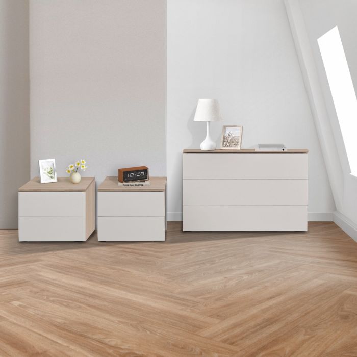 Scopri l’eleganza discreta e funzionale del nostro gruppo letto, composto da un comò a tre cassetti e una coppia di comodini a due cassetti ciascuno.