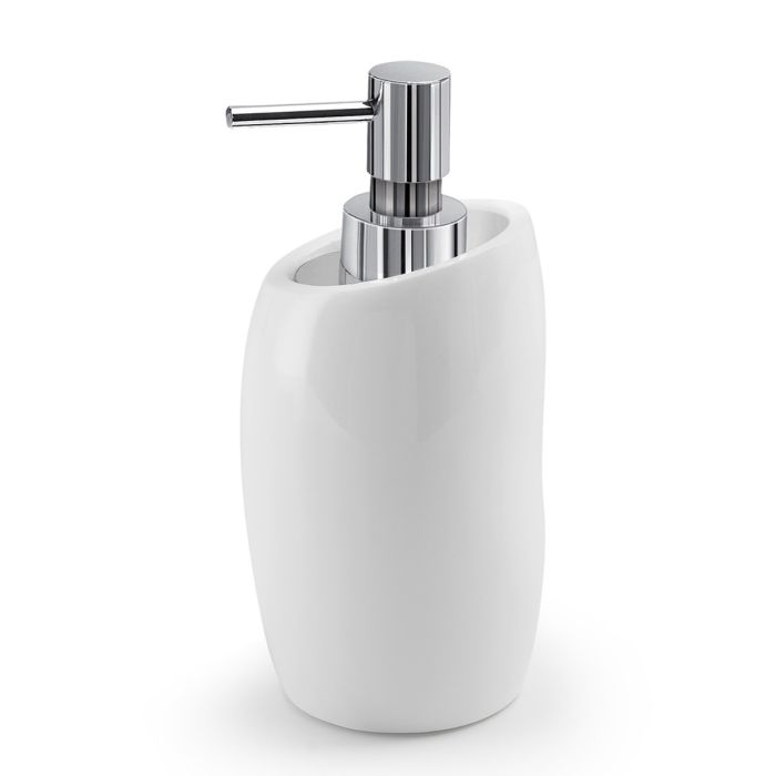 Dispenser sapone linea ISIDE realizzato in resina e sabbia, colore bianco lucido, misura Ø 8,5 × h 16,3 cm, capacità 320ml, dotato di erogatore in Cromall cromato, dal design elegante e moderno, ideale per dosare il sapone con praticità e stile, valorizzando l’ambiente bagno.