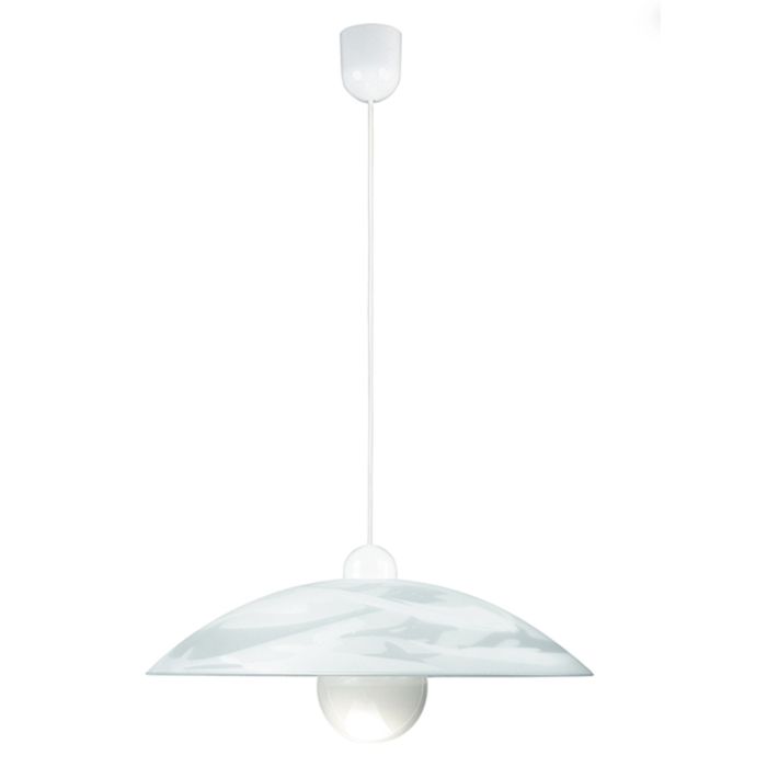 Sospensione singola in vetro curvato effetto alabastro con pendel in plastica bianco.