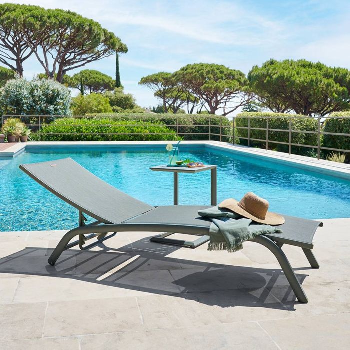 Lettino mod. BONAO con struttura in alluminio colore alloro e schienale/seduta in textilene 530 g/m² colore alloro, reclinabile in 4 posizioni, impilabile e dotato di ruote per facile spostamento; dimensioni 64×171 h.84,5 cm con altezza seduta 34 cm, design leggero, resistente e confortevole ideale per bordo piscina e ambienti outdoor, prodotto fornito montato.