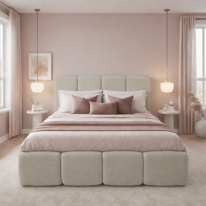 LETTO MATRIMONIALE CONTENITORE MOD. BUBBLE IN TESSUTO BOUCLE' BIANCO LATTE