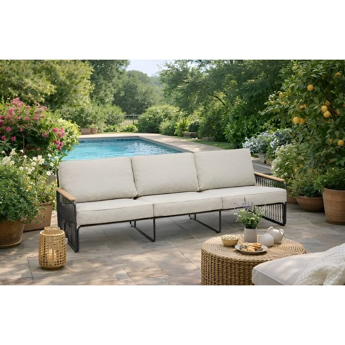 Il divano 3 posti modello RIVA ha struttura in acciaio verniciato antracite, scocca in textilene nero con corda in olefin nera, braccioli in legno di Teak naturale e cuscini sfoderabili in poliestere grigio melange; misura 241 × 87,5 × h 73 cm e viene fornito smontato, ideale per arredare con eleganza e resistenza spazi esterni come terrazze e giardini.