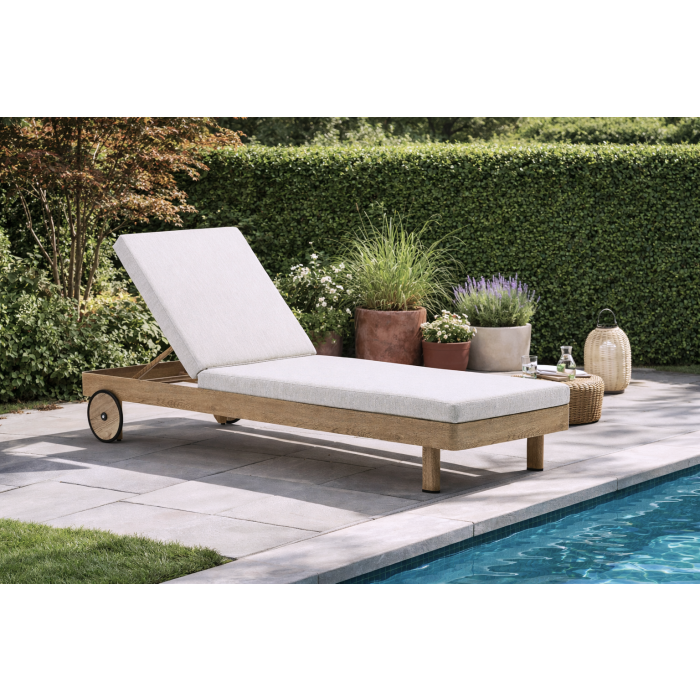 Lettino lounge con struttura in alluminio effetto legno colore naturale, dimensioni 71 × 198 × h.36/87 cm con altezza seduta 36 cm, rivestimento e cuscini in tessuto idrorepellente grigio chiaro sfoderabile, reclinabile in 4 posizioni e dotato di 2 ruote per un facile spostamento; elegante, resistente e pensato per il relax all’aperto, il prodotto viene fornito smontato.