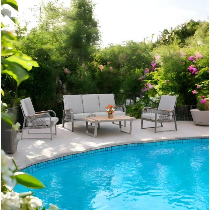 - 1 Divano cm 169X75.5 H.90 - 2 Poltrone cm 65X75.5 H.90 con altezza seduta H cm 43 - 1 Tavolino cm 123X60 H.42.5 - Braccioli e piano tavolino in polywood naturale - Con particolari in corda di poliestere grigia - Cuscini sfoderabili in tessuto poliestere grigio |