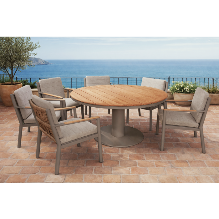 - 1 Tavolo rotondo diam.139 cm H.74.5 in alluminio tortora con piano a doghe in teak - 6 Sedie cm 55.5X60 H.82 in alluminio tortora - Altezza seduta H.cm 49 - Seduta in textilene tortora - Schienale in polywood intrecciato - Cuscino in tessuto melange beige sfoderabile - Braccioli con particolari in teak |